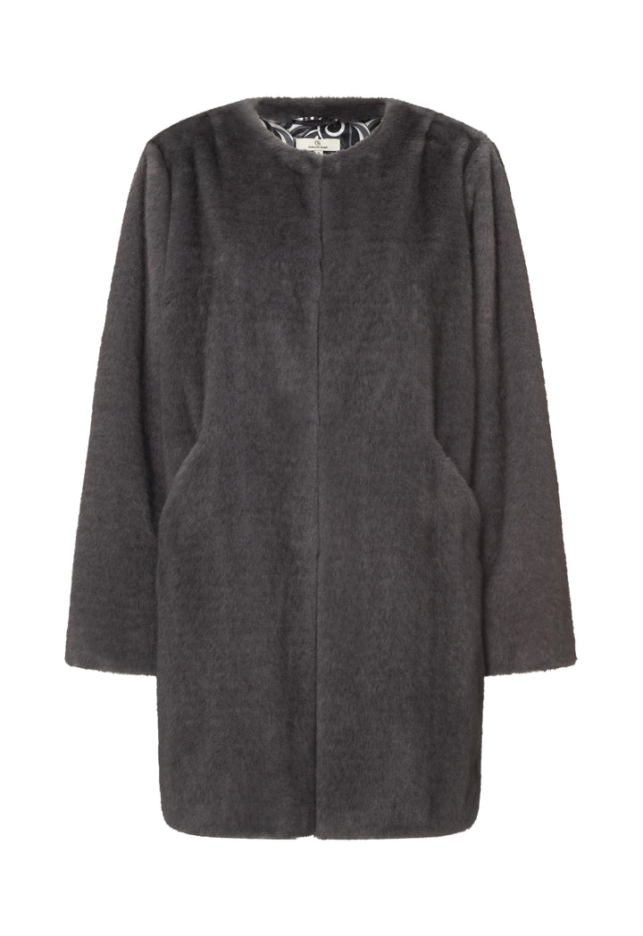 Fake fur coat with big hidden push buttons and two hidden pockets.