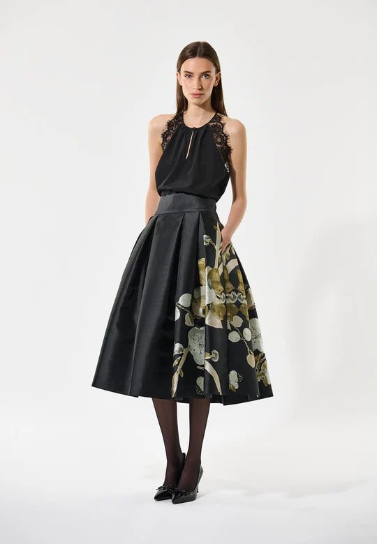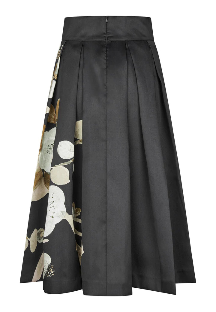 Mid calf length full skirt with deep box pleats and a wide waistband. Crafted from black taffeta printed with over sized lotus blooms, it is perfect for evening paired with a simple shirt or fine knit and elegant heels.