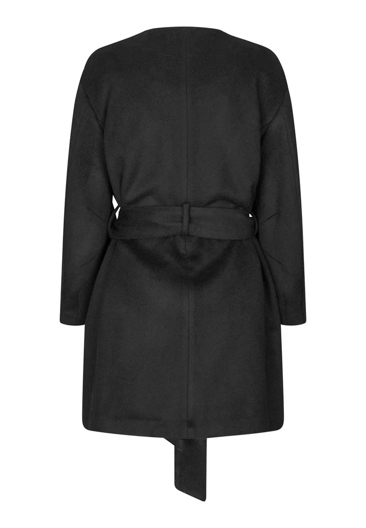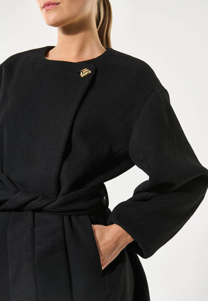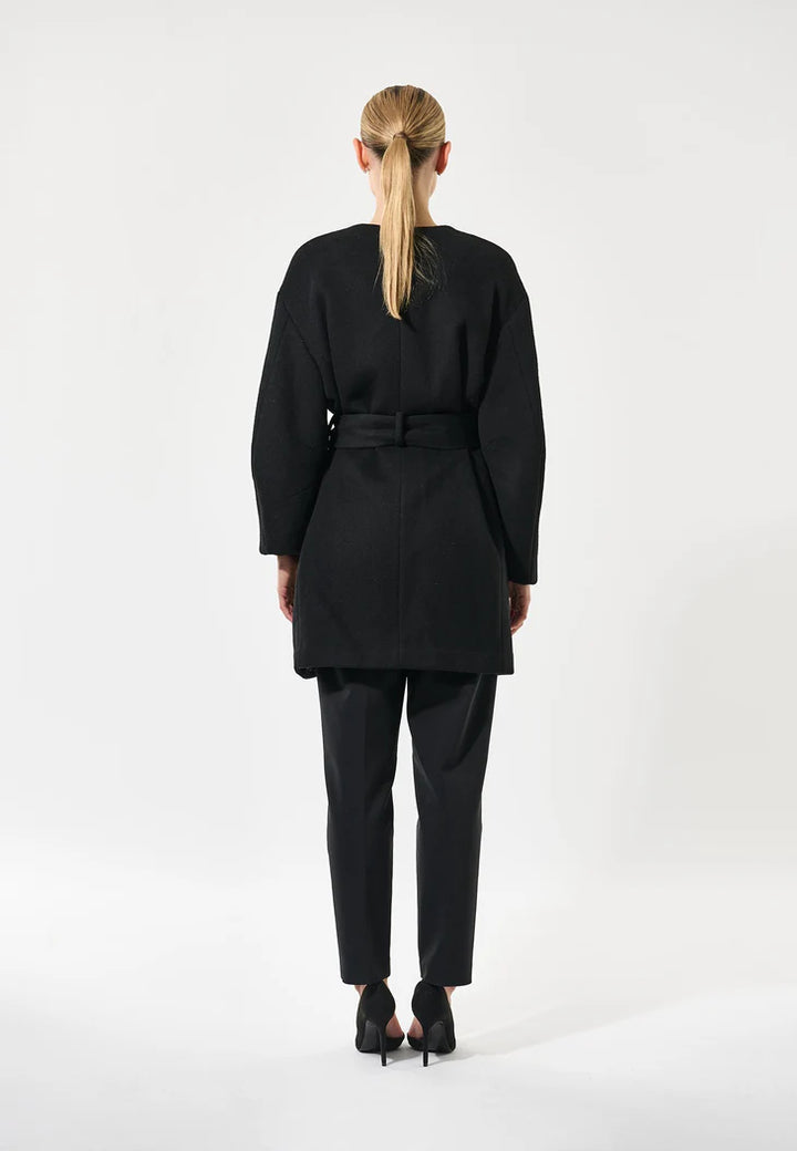 Collarless black coat with an asymmetric front and a single decorative button at the shoulder. It has sculptural shaped sleeves, slit pockets in the side seams and a self fabric belt pulls it into the waist. The coat is fully lined and falls to just above the knee.
