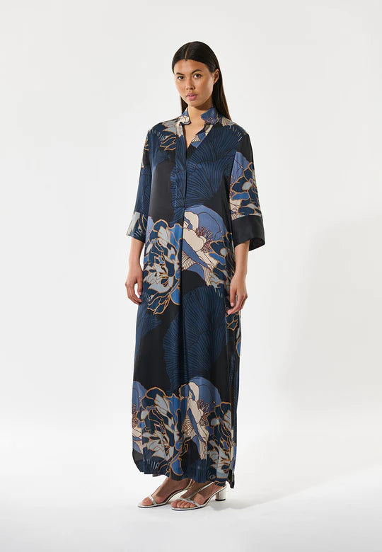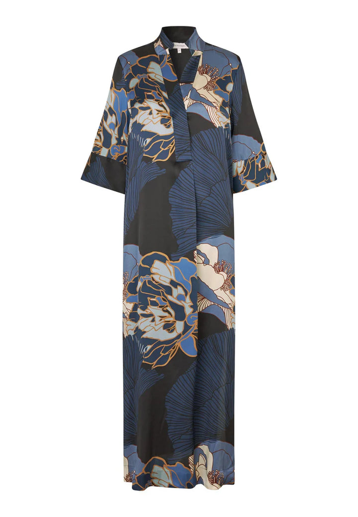 Helga is an easy fit full length dress with a kimono style neckline, stand collar and 3/4 length wide sleeves.
