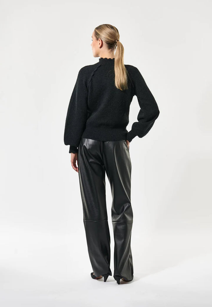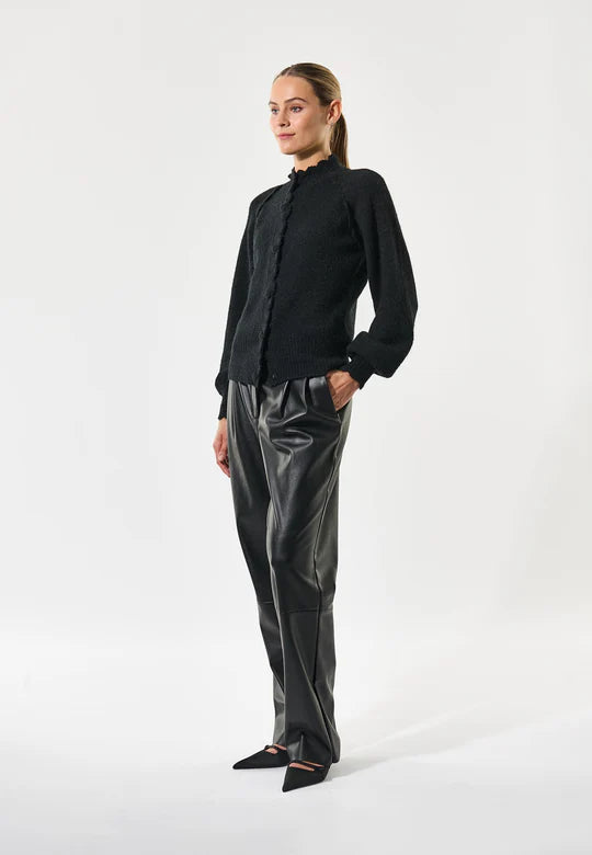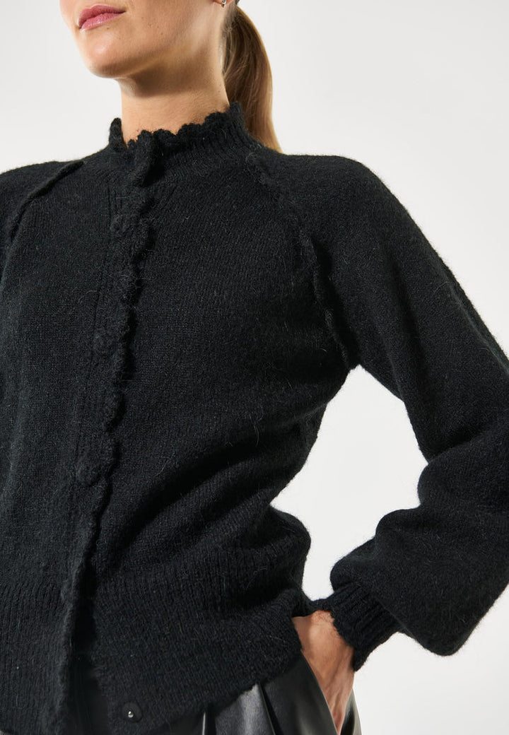 Alpaca mix cardigan with delicate scalloping on the front, shoulder seams, cuffs and high neck. It is slightly fitted and has deep ribs at the cuffs and waist. It fastens with beautiful crocheted buttons.