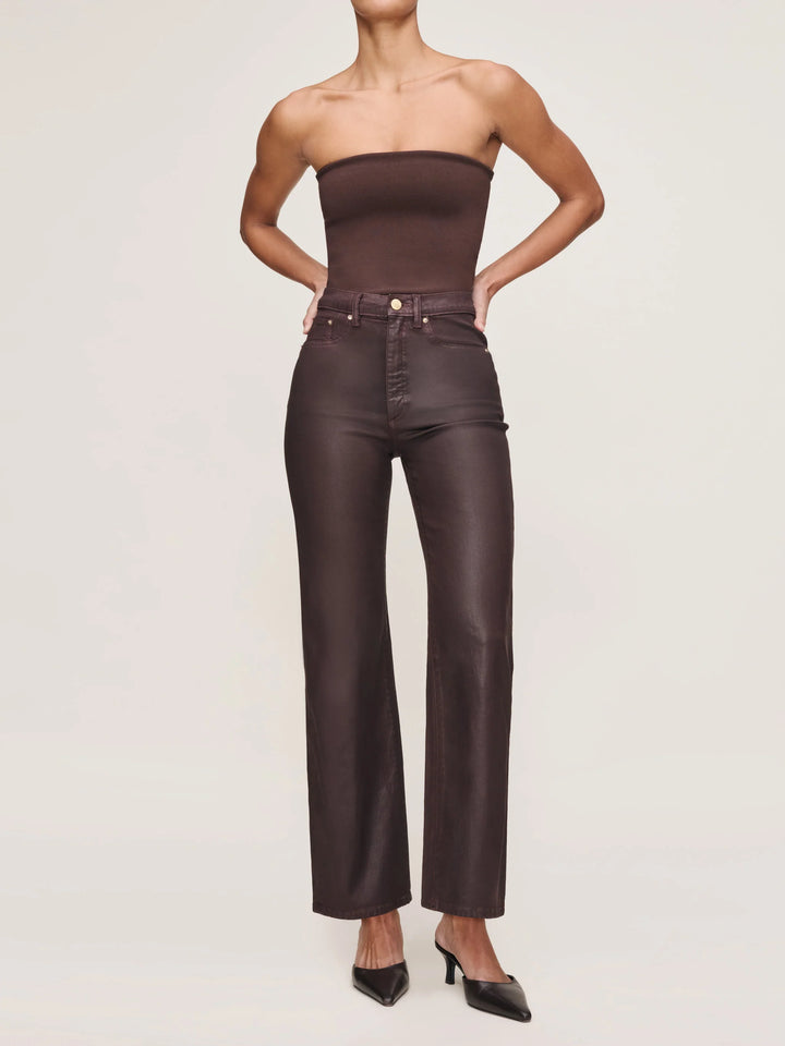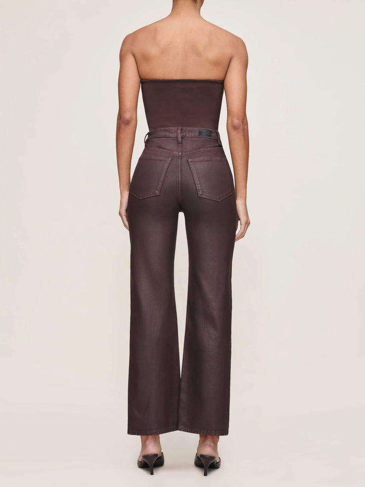 Fig is a light, muted red coated denim with a purple undertone. It features gold hardware, tonal stitching, a clean hem and a black back patch.