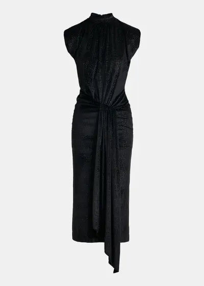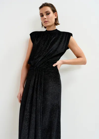 FIgure hugging midi dress, cut from a stretch-jersey fabric embellished with black-tone dots for a glitter-like finish. The dress has a wrap-inspired skirt with box pleat gathering at the front and generous split. Lightly padded shoulders and a flattering mock neck complete the design.