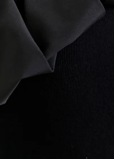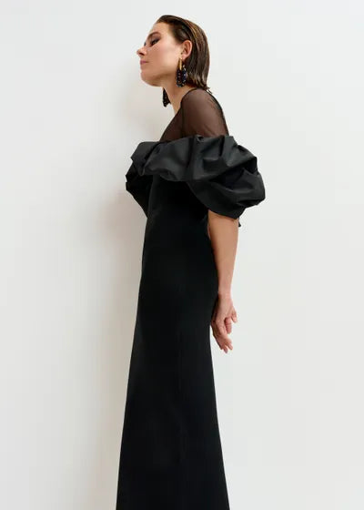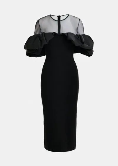 Ribbed dress with a close-fitting silhouette accented by a structural ruffle that frames the shoulders for a dramatic effect. The sheer tulle yoke and sleeves add an airy lightness, balancing the structured design. Falling to a straight midi hem, it makes a striking choice for evening occasions.