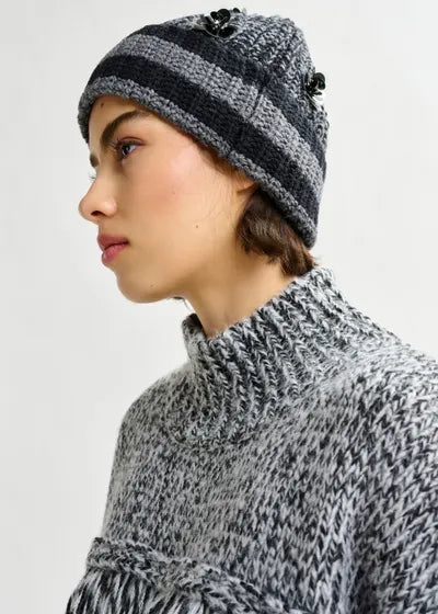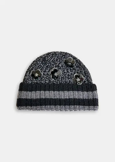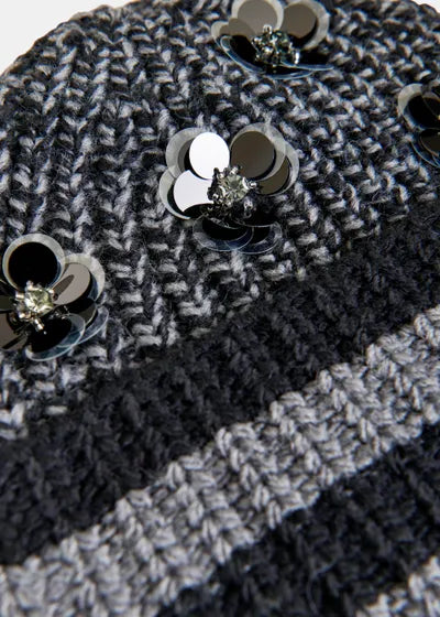 Knitted in a dense wool blend this beanie features a contrast striped fold-over brim and has floral sequinned embellishments complimented by glass rhinestones.