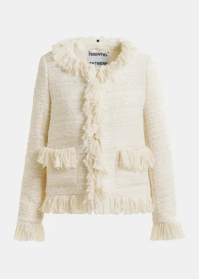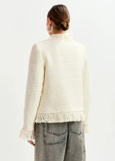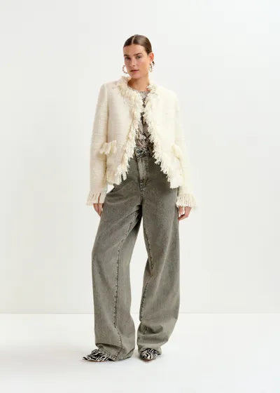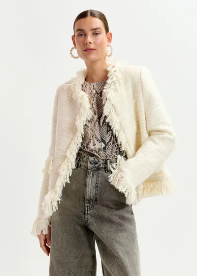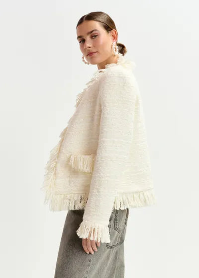 Textured wool blend jacket with hook and eye fastening, patch pockets and fringe details along the collar, placket and cuffs. A jacket with a boxy silhouette which works so well with jeans or tailored pants. Fully lined.