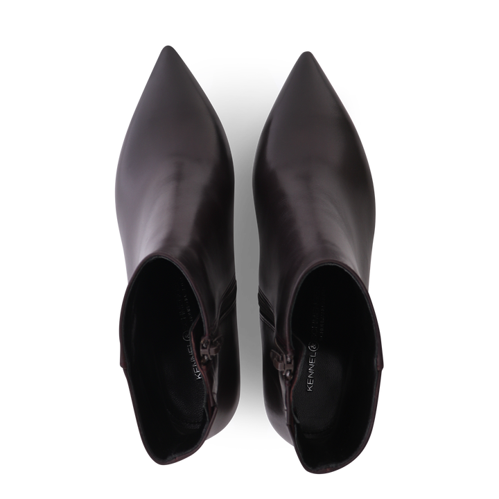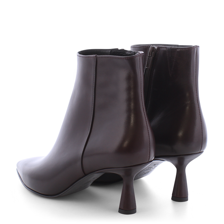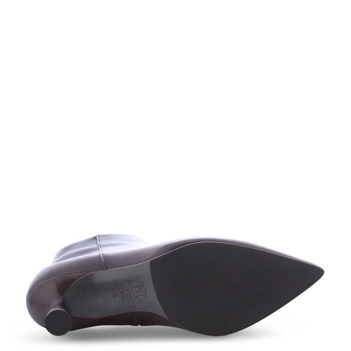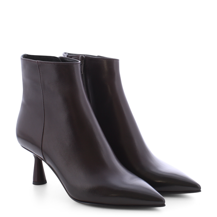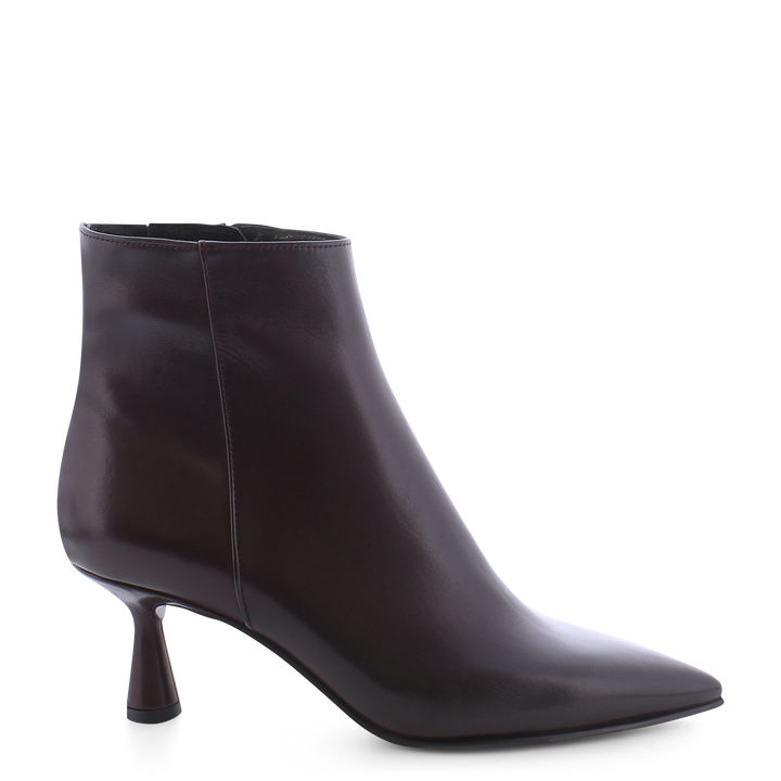Leather ankle boot with pointed toe and kitten heel. These boots work well worn with wide leg trousers or jeans or with a dress or skirt.