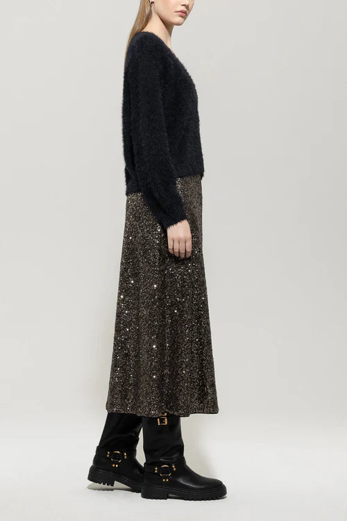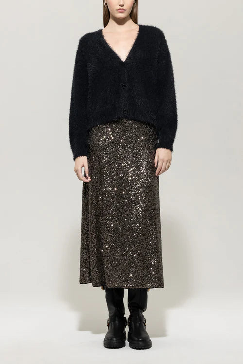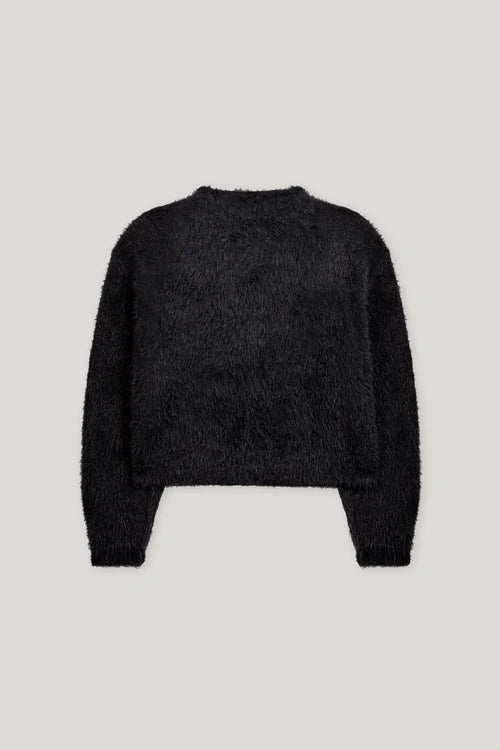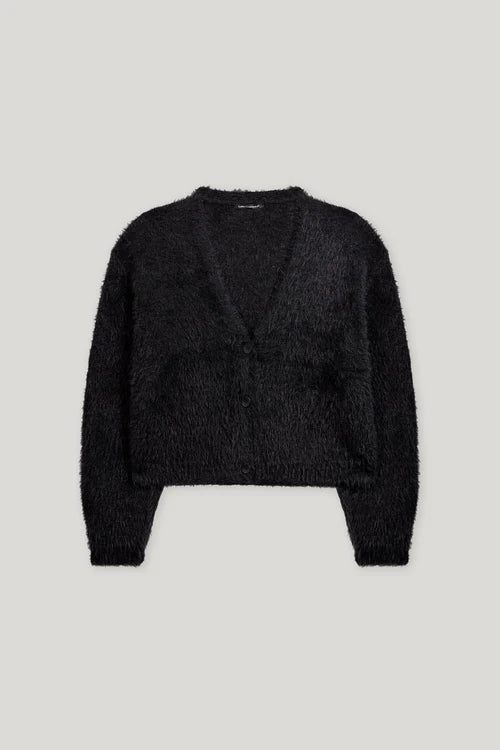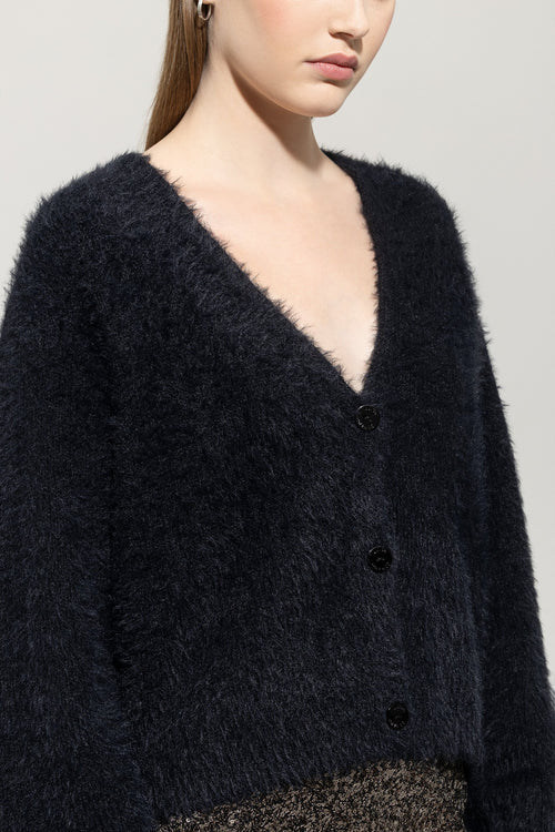 Cardigan in a knitted fake fur look on a wool base. There is a short button placket on the front.