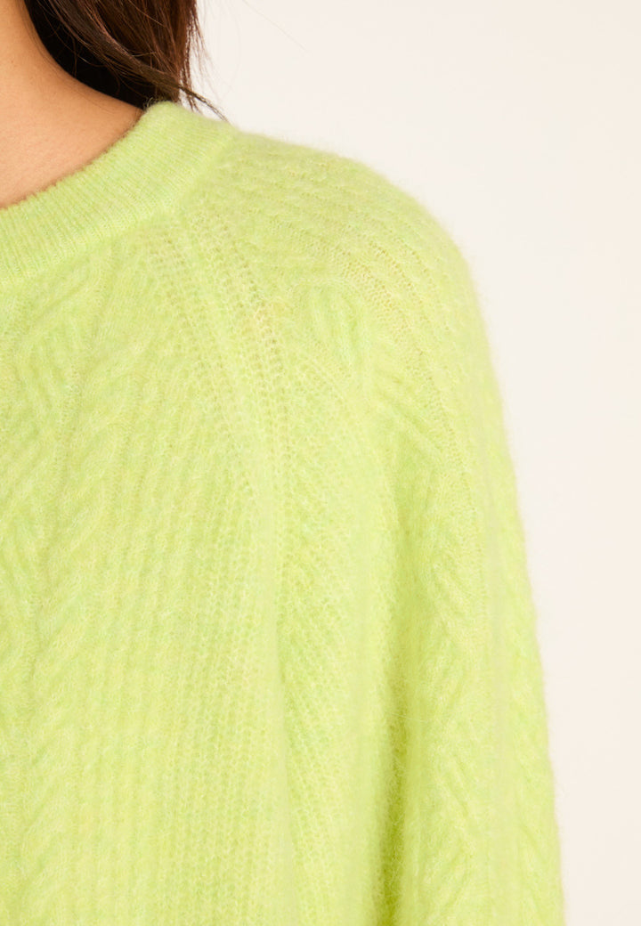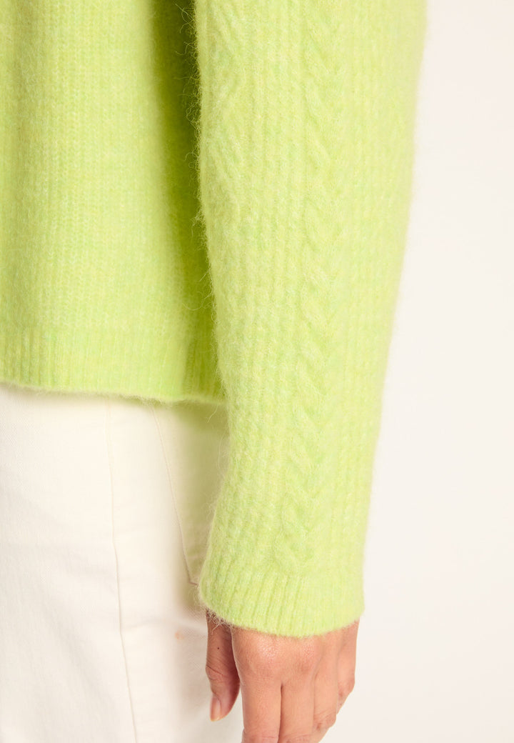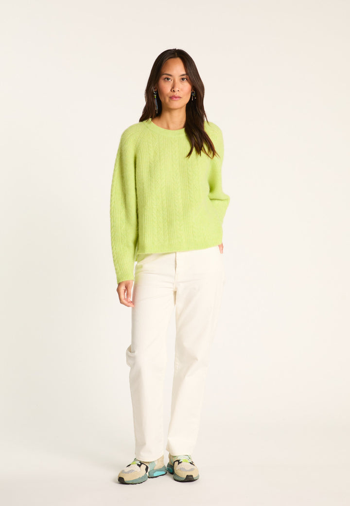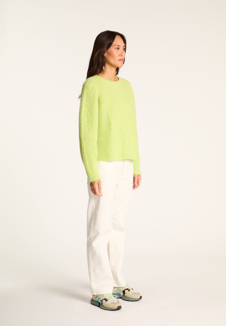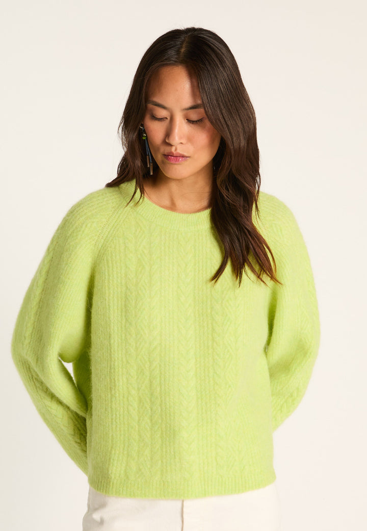 A soft, comfortable sweater in merino wool and alpaca with a round neck and slightly cropped style, The sleeves are a subtle balloon shape and the body is a relaxed fit.