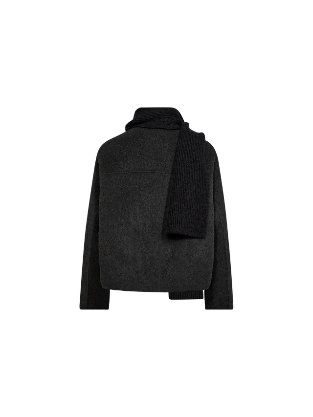 Cropped wool jacket with detachable scarf. It has a sophisticated button closure and functional pockets for effortless versatility.
