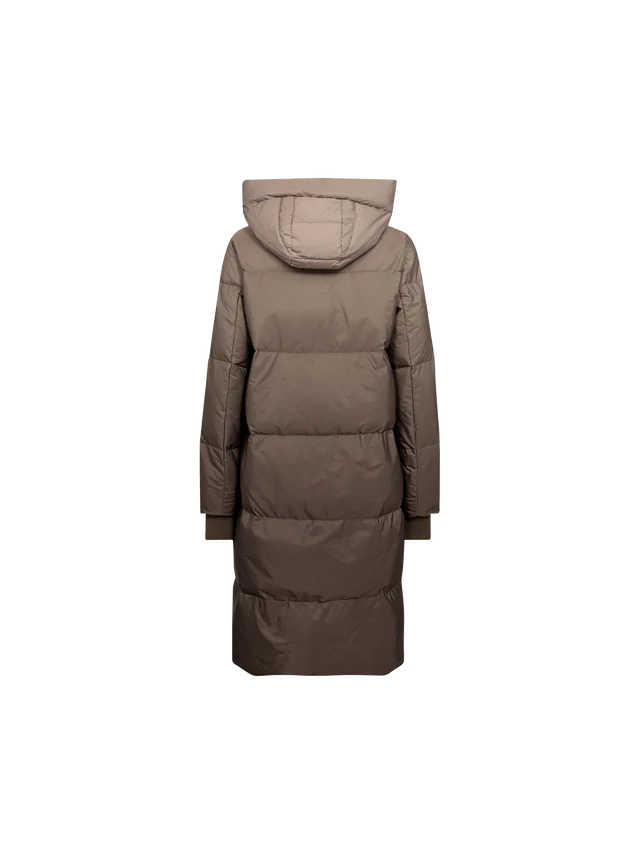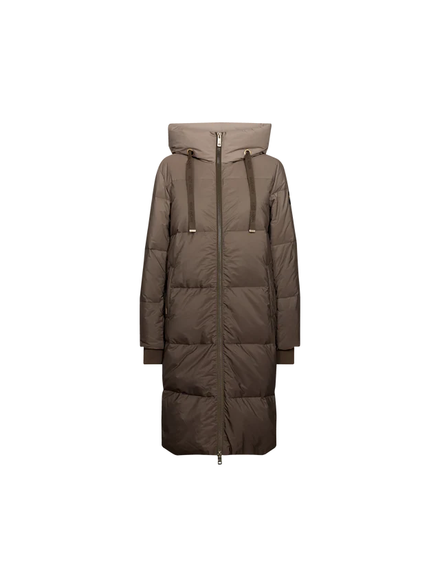 This Nova down coat is designed with a dip dye effect. It has a a high practical collar, a heavy zipper, pockets, and chunky drawstrings.