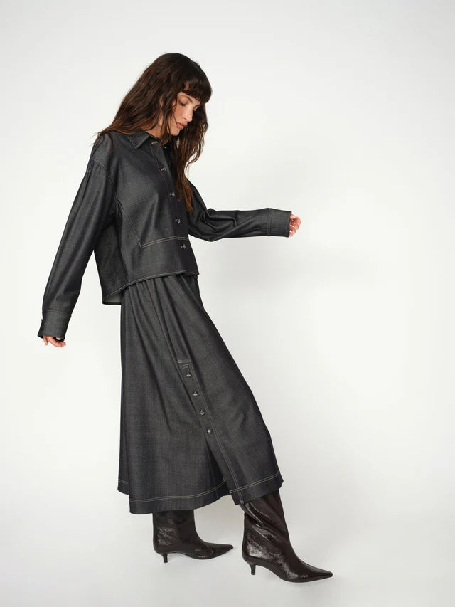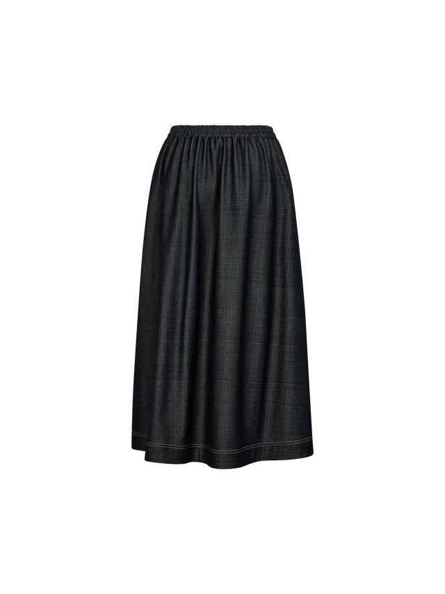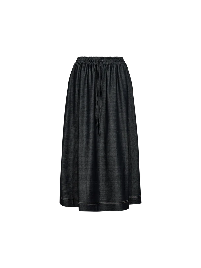 Knee length skirt crafted from soft denim enriched with TENCEL™ Lyocell, offering a breathable and lightweight feel. Designed with a flattering mid/high waist, it features an elasticated waistband with adjustable drawstrings for ultimate comfort and a perfect fit. Wear it with the matching denim shirt for a coordinated look or pair it with a casual tee or knit for effortless everyday style.