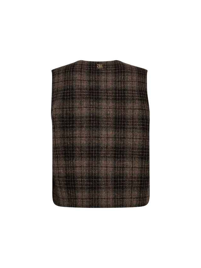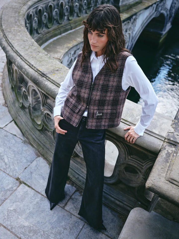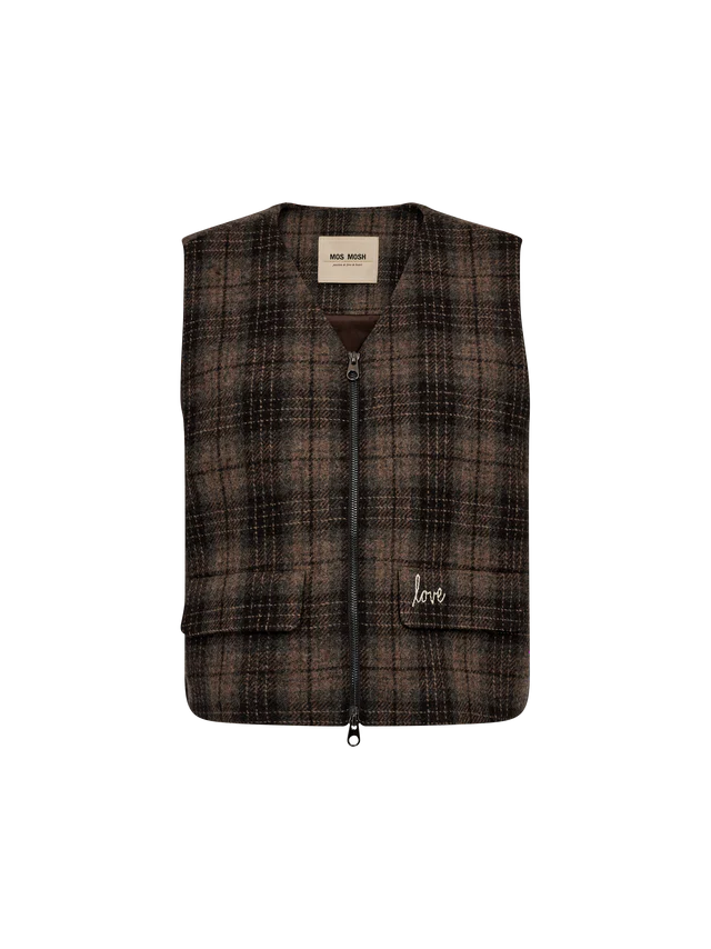Checked gilet with a sleek zip closure, front flap pockets, and subtle “love” embroidery — a signature MOS MOSH touch. Perfect for layering over shirts, knits, or under your favourite coat when its really chilly.