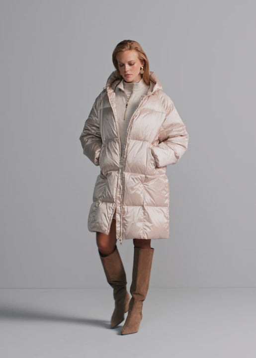 Knee length quilted coat with a wide cut, generous hood and full-length zip. The lightweight, functional material mix provides warmth with minimal weight.